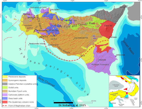 • The Sicily fold-and-thrust belt, which is the accretionary wedge of the Calabrian subduction zone