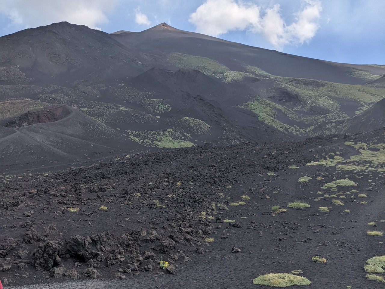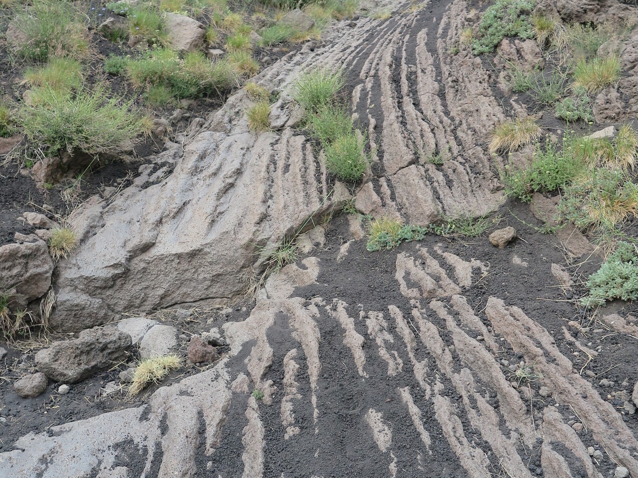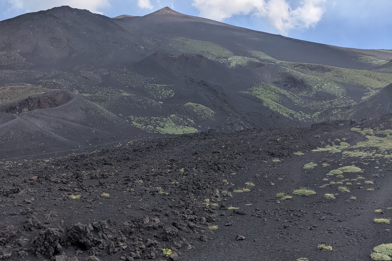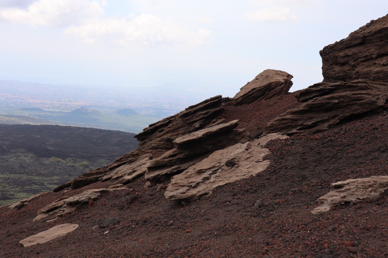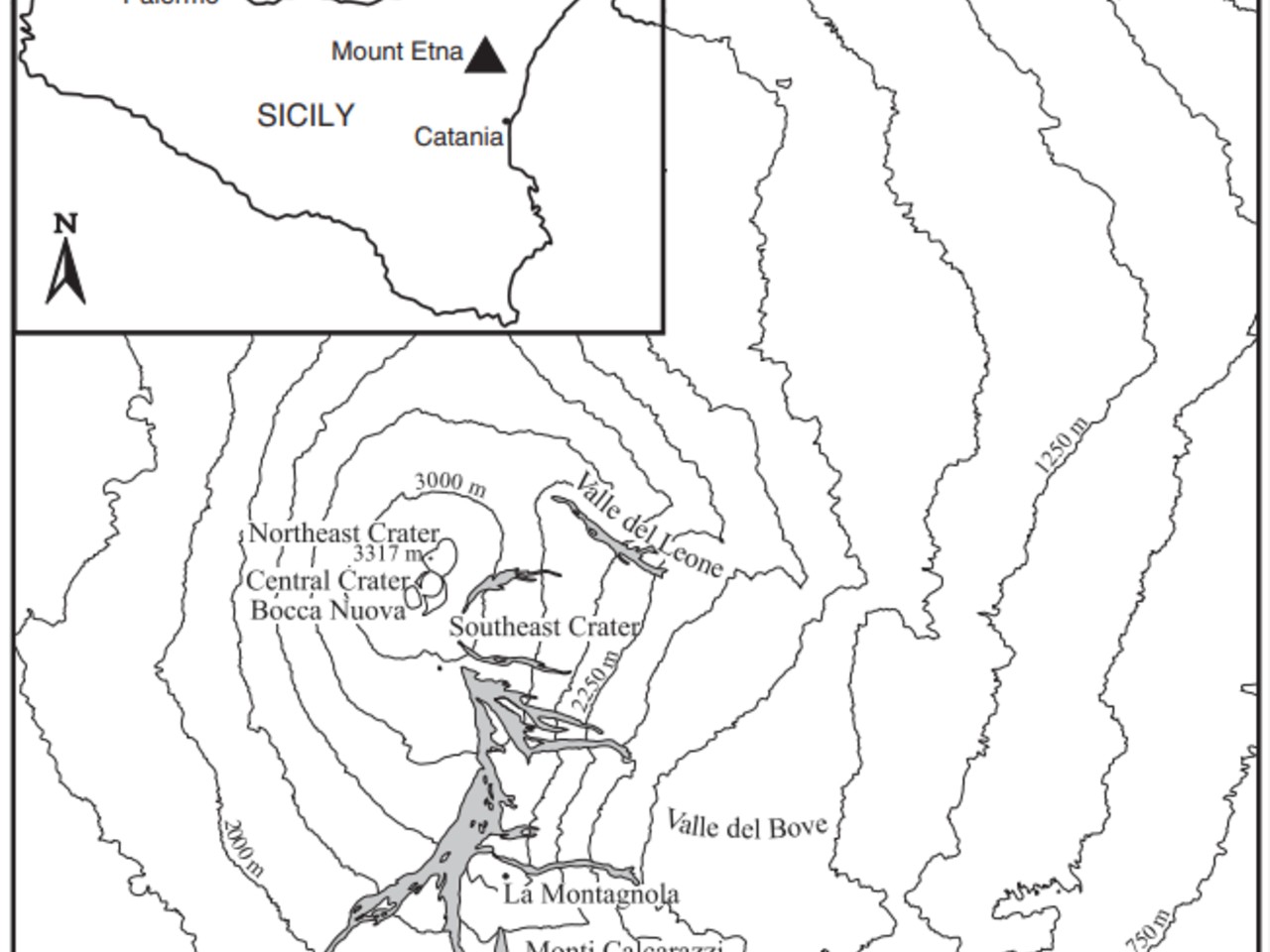 Etna is peaking up at 3375m above sea level and still an active stratovolcano, as we can see for the 2001 eruption. Indeed eruptions occurred in a frequence of 1-2 years. This eruption occurred in the southern flank of Etna, as you can see at the volcanic crater Crasteri Silvestri. Recent activies of Etna show an effusive style of eruption: lava flow propagated on the floor whose velocity of displacement depends of the topography. Volcanic products are very porous with weak densities, mainly composed by glass and some crystals such as clinopyroxenes and pagioclases. This is a basaltic composition, a typical geochemistry found in effusive eruptions. Etna also has phreatomagmatic activity, which means violent explosions and abundant tephra deposits (seen as thin light layers on the field).