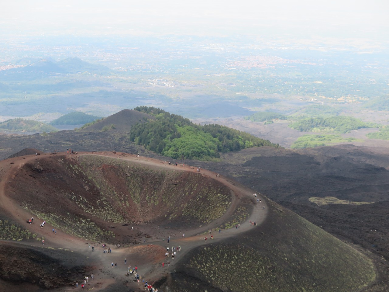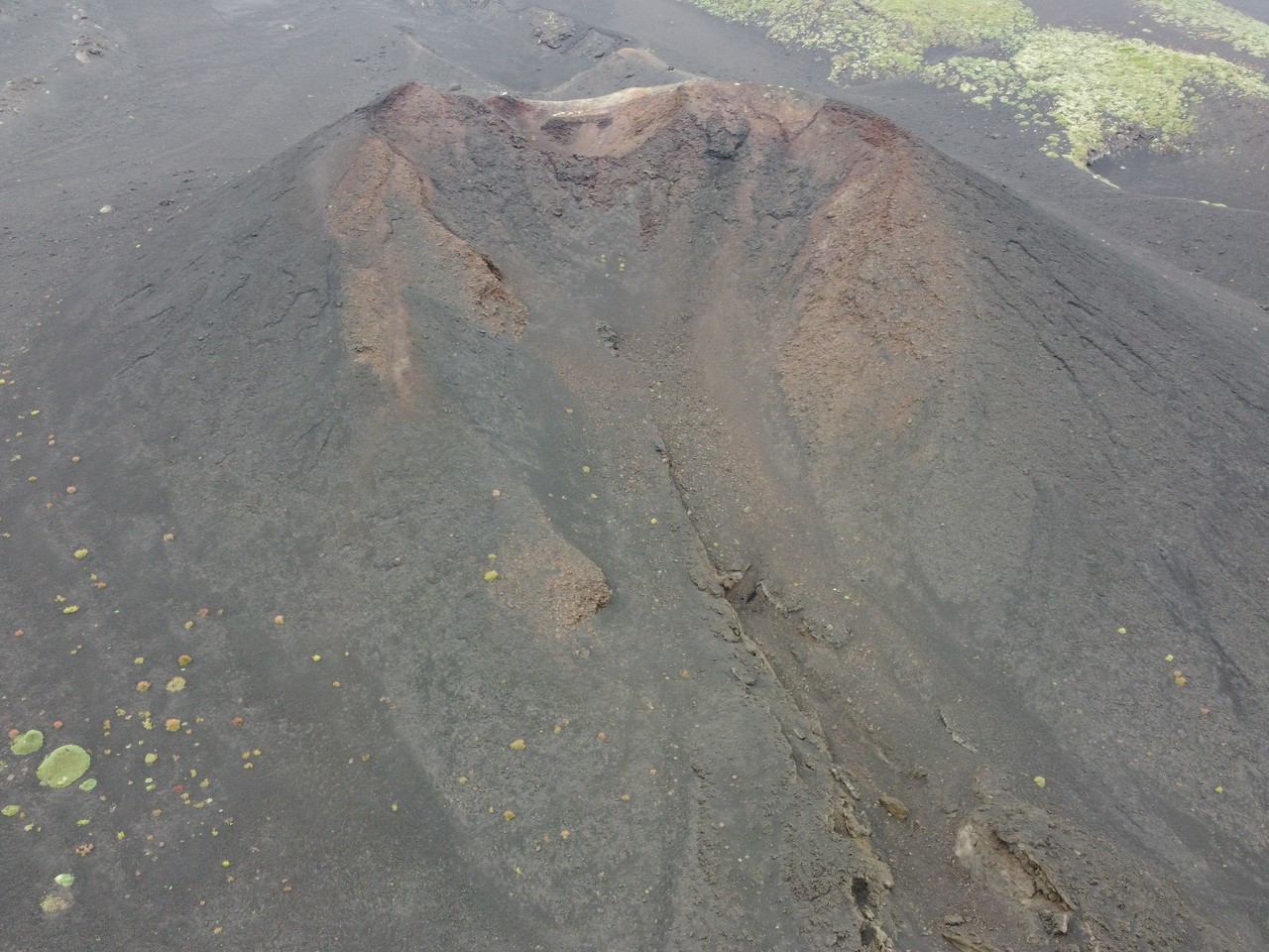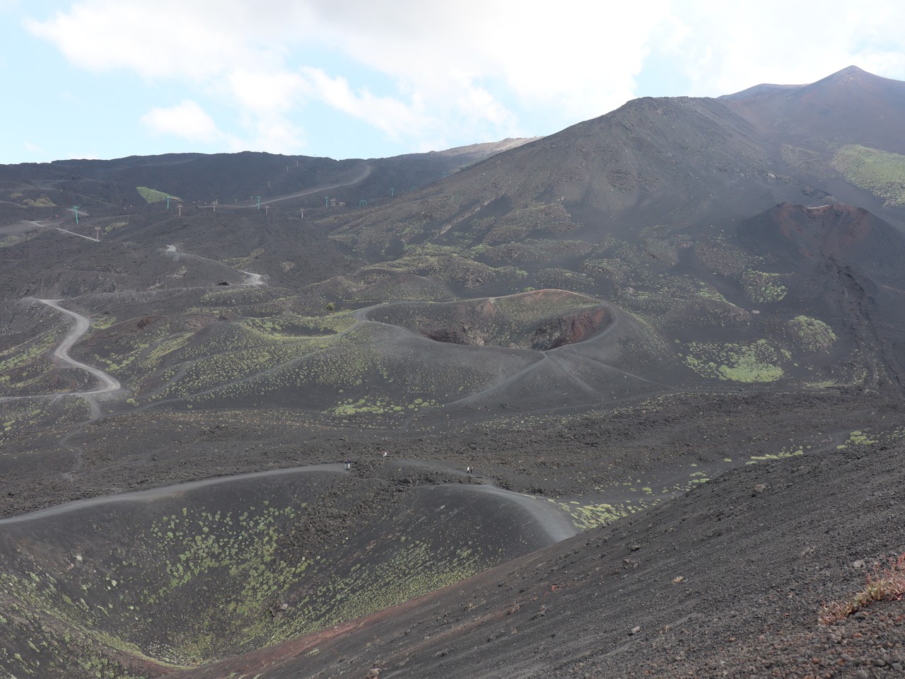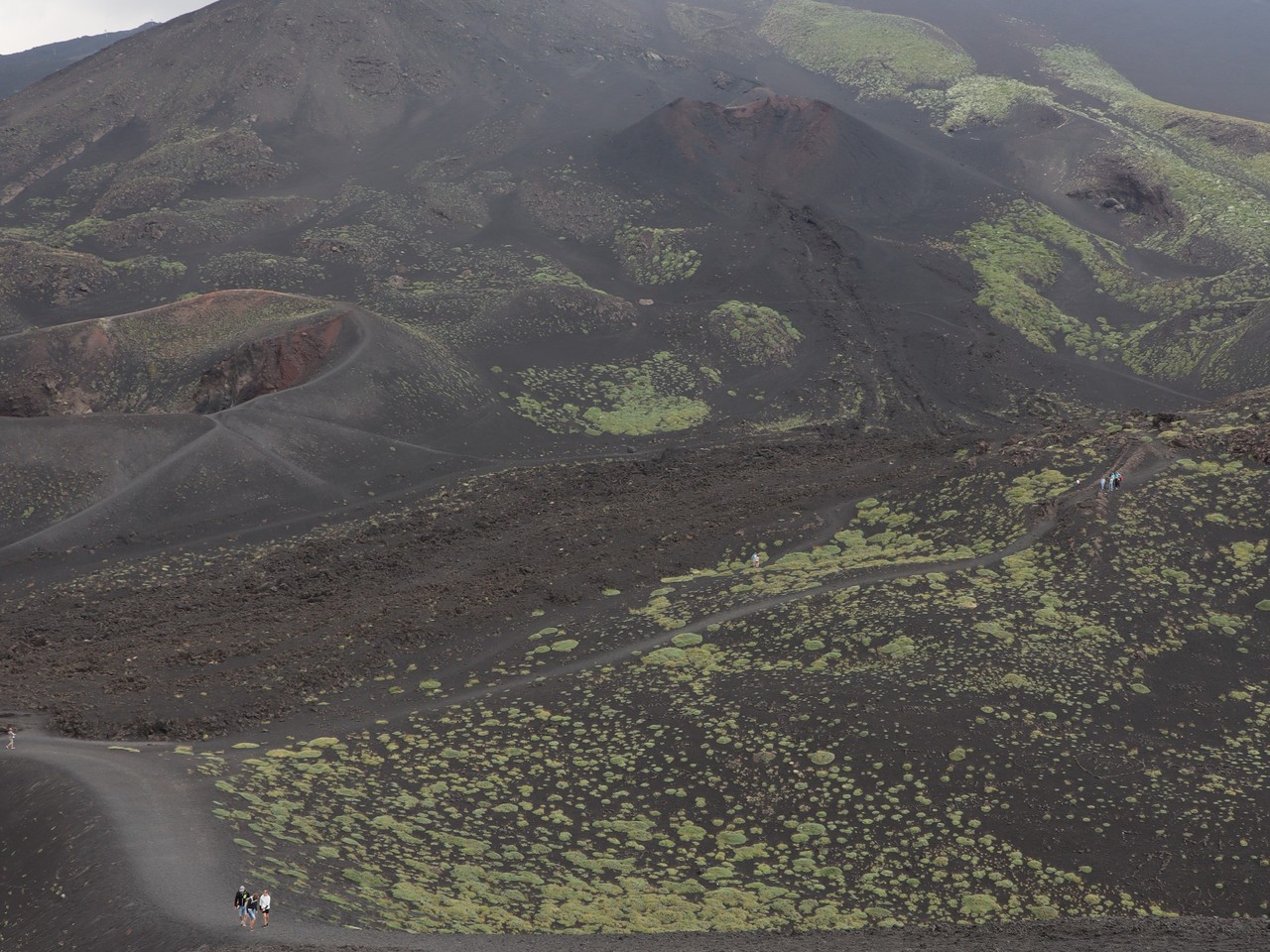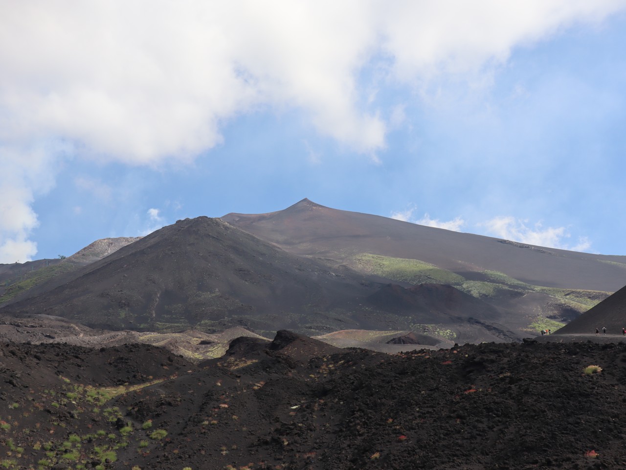 Etna is peaking up at 3375m above sea level and still an active stratovolcano, as we can see for the 2001 eruption. Indeed eruptions occurred in a frequence of 1-2 years. This eruption occurred in the southern flank of Etna, as you can see at the volcanic crater Crasteri Silvestri. Recent activies of Etna show an effusive style of eruption: lava flow propagated on the floor whose velocity of displacement depends of the topography. Volcanic products are very porous with weak densities, mainly composed by glass and some crystals such as clinopyroxenes and pagioclases. This is a basaltic composition, a typical geochemistry found in effusive eruptions. Etna also has phreatomagmatic activity, which means violent explosions and abundant tephra deposits (seen as thin light layers on the field).