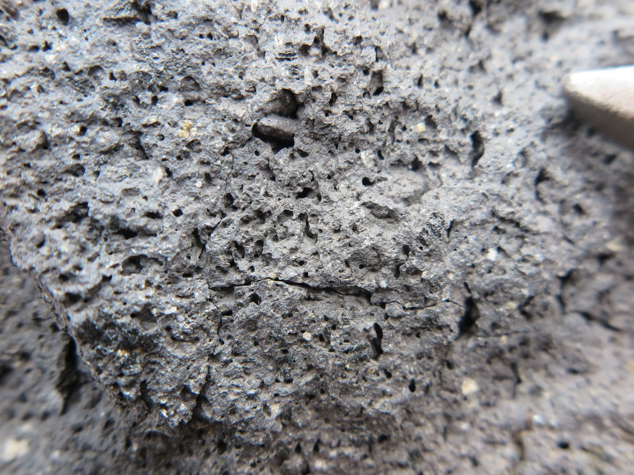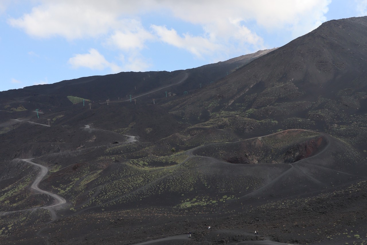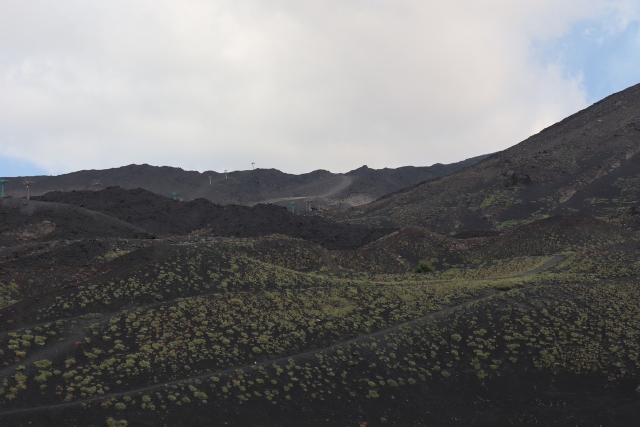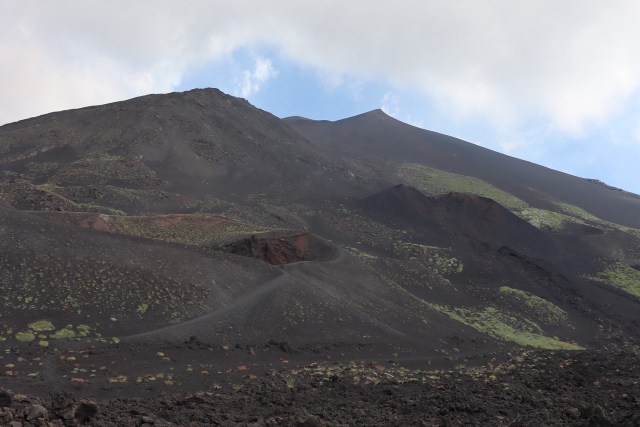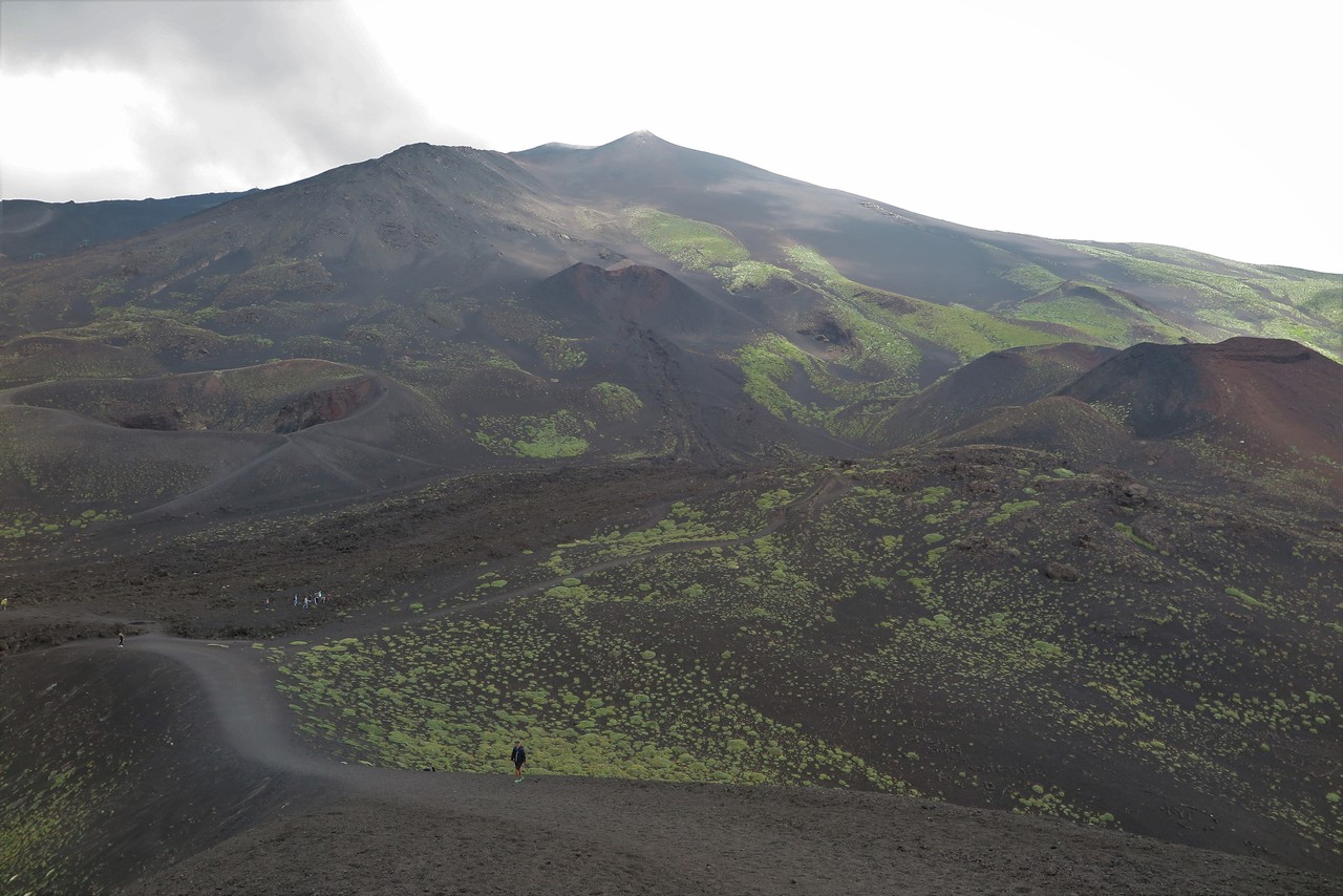 Etna is peaking up at 3375m above sea level and still an active stratovolcano, as we can see for the 2001 eruption. Indeed eruptions occurred in a frequence of 1-2 years. This eruption occurred in the southern flank of Etna, as you can see at the volcanic crater Crasteri Silvestri. Recent activies of Etna show an effusive style of eruption: lava flow propagated on the floor whose velocity of displacement depends of the topography. Volcanic products are very porous with weak densities, mainly composed by glass and some crystals such as clinopyroxenes and pagioclases. This is a basaltic composition, a typical geochemistry found in effusive eruptions. Etna also has phreatomagmatic activity, which means violent explosions and abundant tephra deposits (seen as thin light layers on the field).