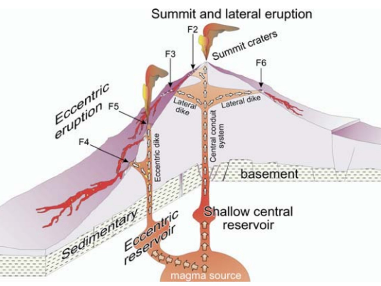 Two magmas have been involved during 2001 eruption: one which drains laterally from the conduits and is erupted from fissures further downslope, and one which is erupted vertically from an eccentric reservoir, in contact with the sedimentary substratum. Phreatomagmatic activity occured mostly by volcanic products coming from the eccentric dyke.