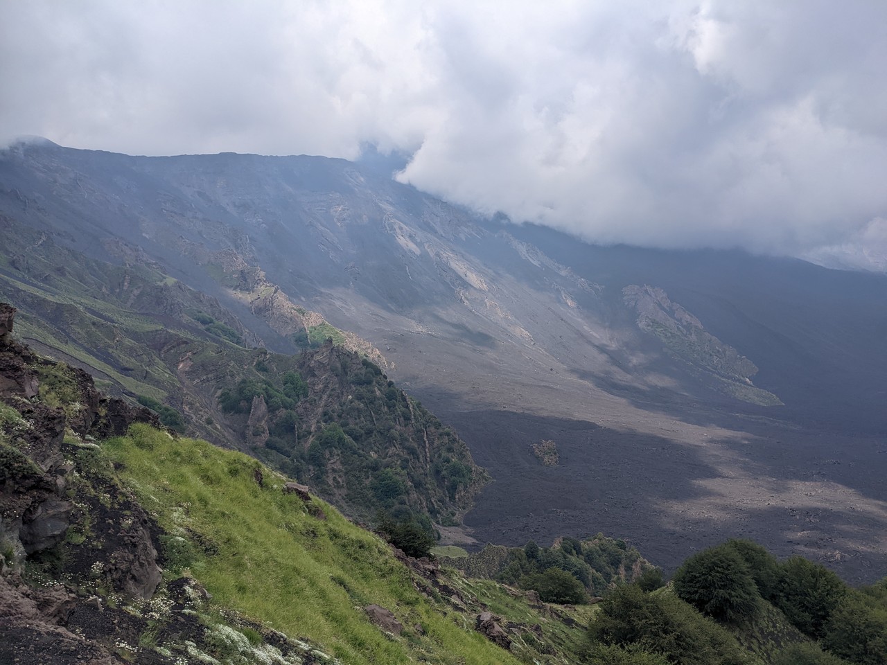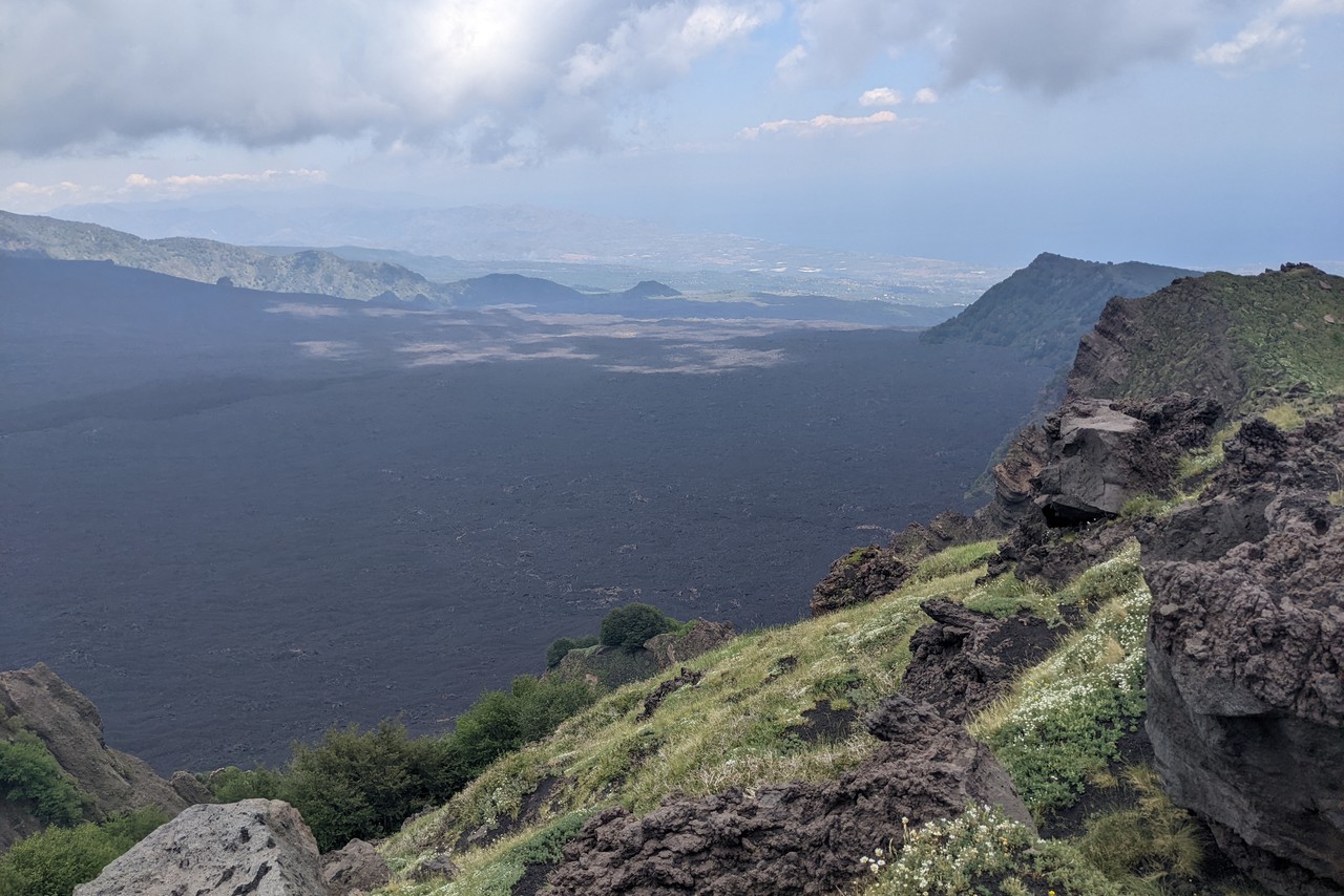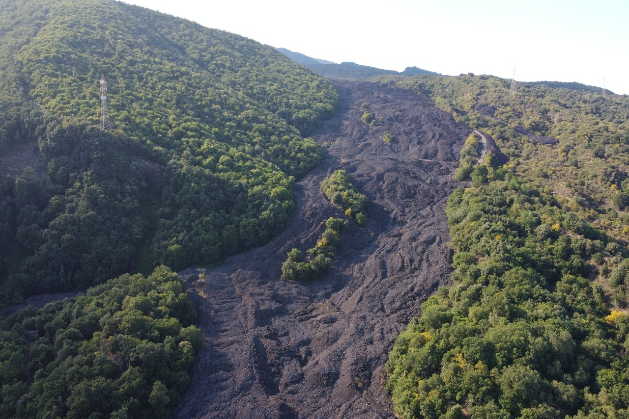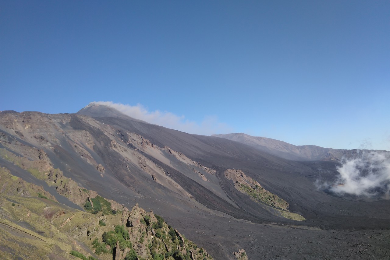 Valle del Bove sequence is a large depression with several rocky elevations taking place in between black tongues of lava flows. These are remnants of a complex of, at least, seven distinct volcanoes. Around 10 thousand years ago, a catastrophic collapse of the eastern flank of Mount Etna caused the formation of this valley, where part of the material moved in a form of debris flow towards the sea. The remnants of ancient volcanoes are characterized by stratified flanks at both sides of the valley. The chemical composition of the volcanic products is changing with time. The silica content increases in the more recent lava. There is also a progressive shift of the eruptive activity towards the northwest.