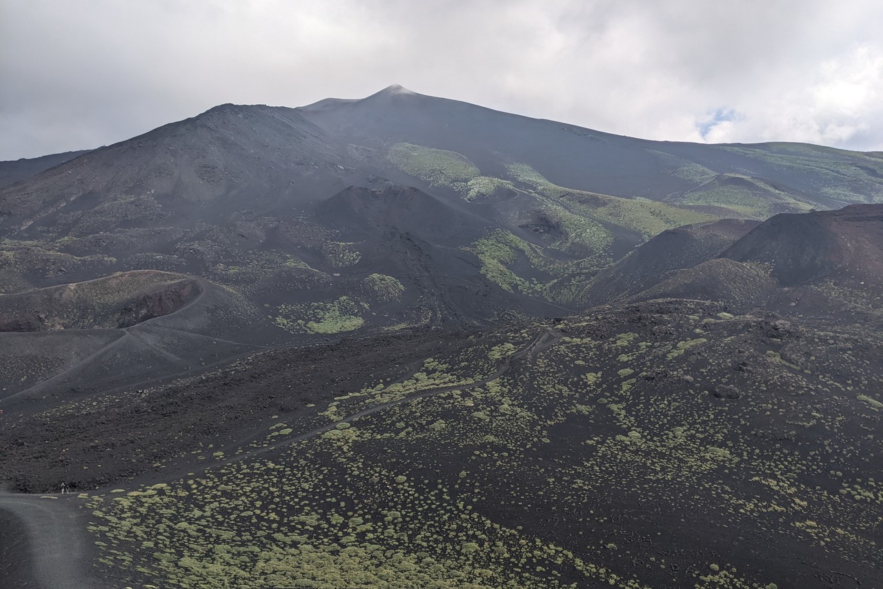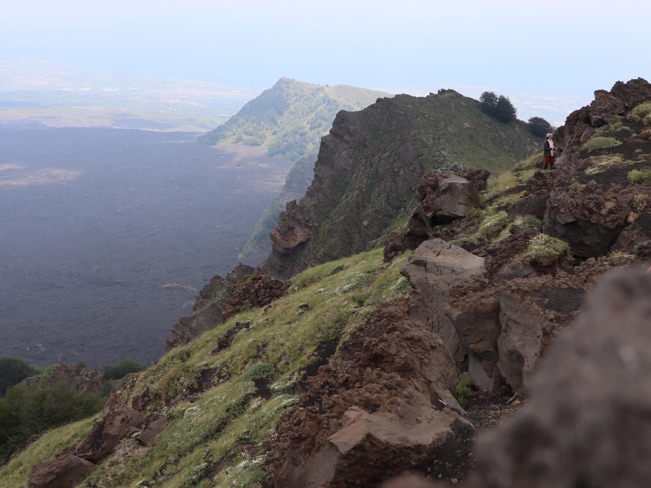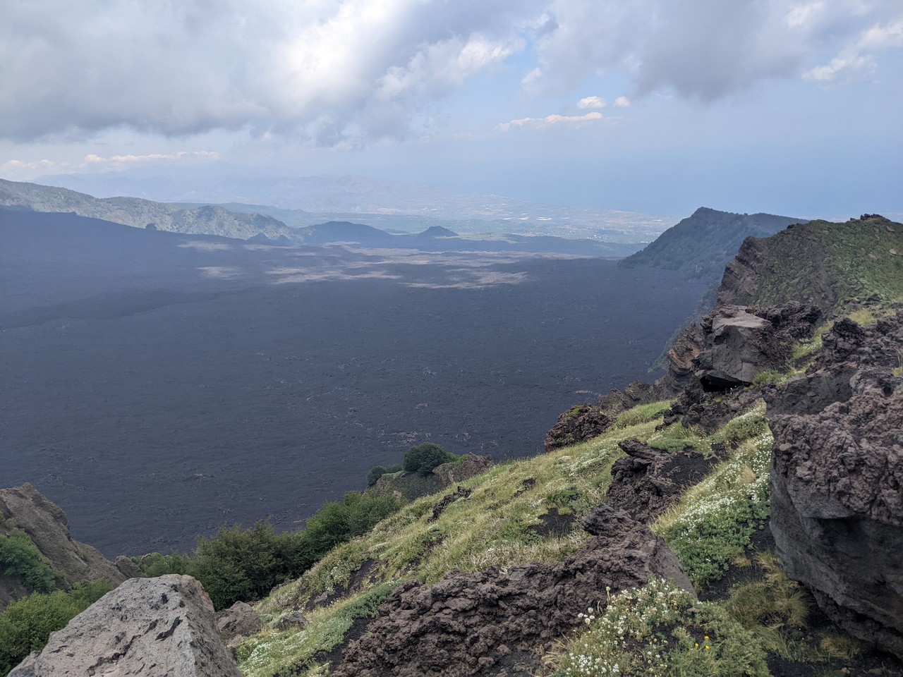 Valle del Bove sequence is a large depression with several rocky elevations taking place in between black tongues of lava flows. These are remnants of a complex of, at least, seven distinct volcanoes. Around 10 thousand years ago, a catastrophic collapse of the eastern flank of Mount Etna caused the formation of this valley, where part of the material moved in a form of debris flow towards the sea. The remnants of ancient volcanoes are characterized by stratified flanks at both sides of the valley. The chemical composition of the volcanic products is changing with time. The silica content increases in the more recent lava. There is also a progressive shift of the eruptive activity towards the northwest.