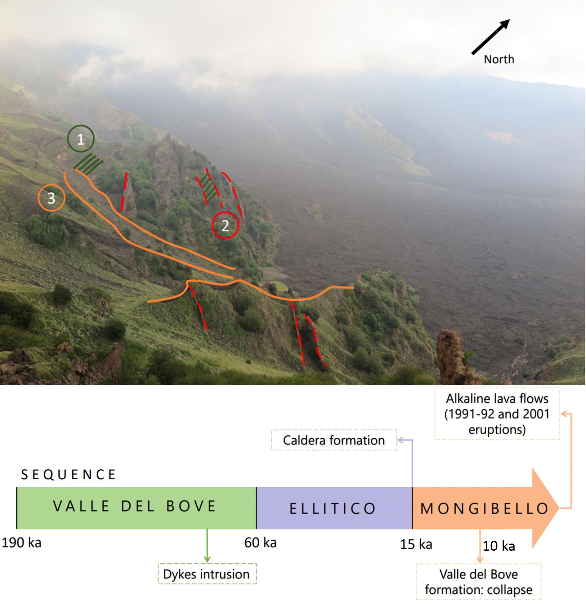 Valle del Bove is a formation showing several stages of Etna history and its chronological events, as illustrated in the timeline in the accompanying figure. Magmatic activity has not been constant during Etna’s history and Valle del Bove is the perfect example of its evolution. The chemical composition of the volcanic products is changing with time. The silica content increases towards more recent lavas. There is also a progressive shift of the eruptive activity towards the northwest. The first stage, till ca 60 ka ago, is named as the Valle del Bove sequence. The volcano started to growth slowly and emitted mafic volcanic products at this time, with abundant pyroxene crystals. Then multiple vertical dykes began to intrude the edifice, cutting the Valle del Bove sequence. After 60 ka, the stabilization of the plumbing system led to the Elittico period, corresponding to the maximum stage of the edifice growth. Ellitico activity ended after caldera-forming Plinian eruptions 15ka ago. This stage is only observed in the south side of the flank. Crystals composition is more felsic. Finally, the Mongibello volcano has been formed during the last 15 ka. It is mostly the current volcano surface, characterized by lava flows (2001 eruptions, as an example, which flew over the dykes and Valle del Bove unit).