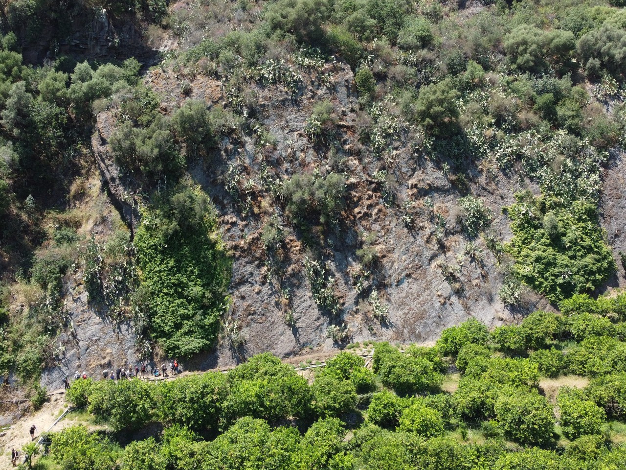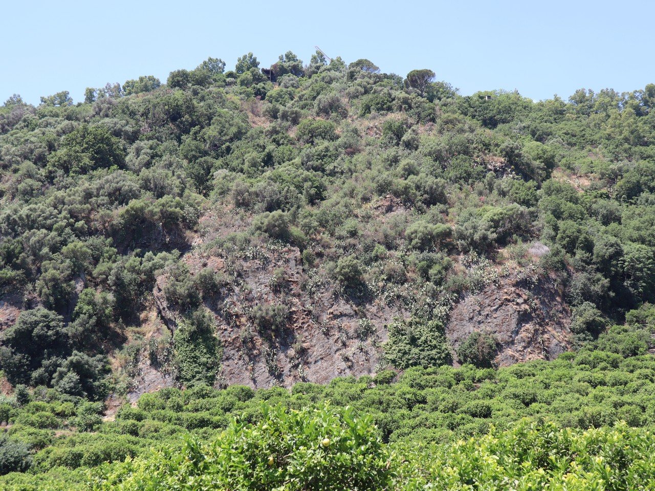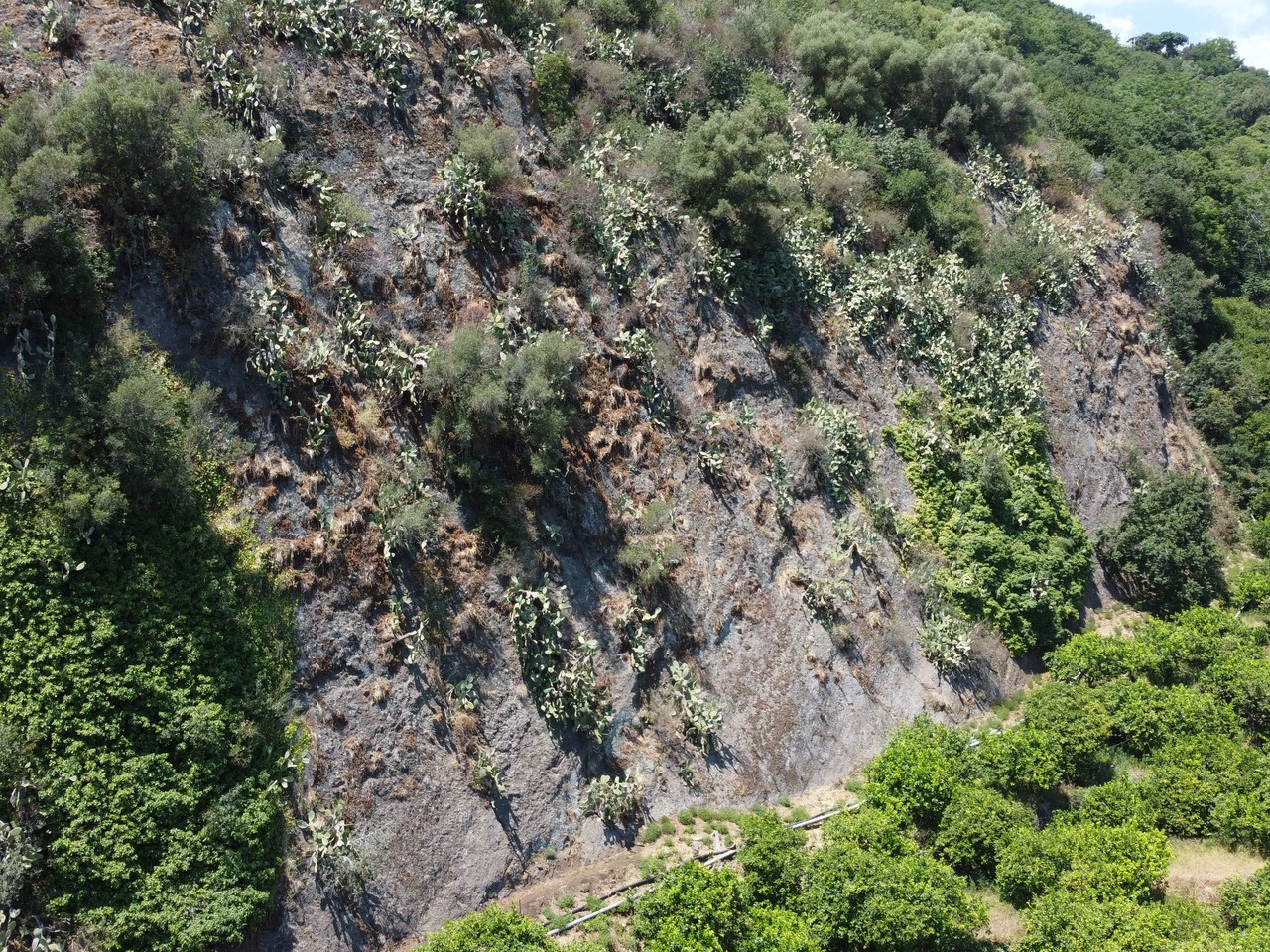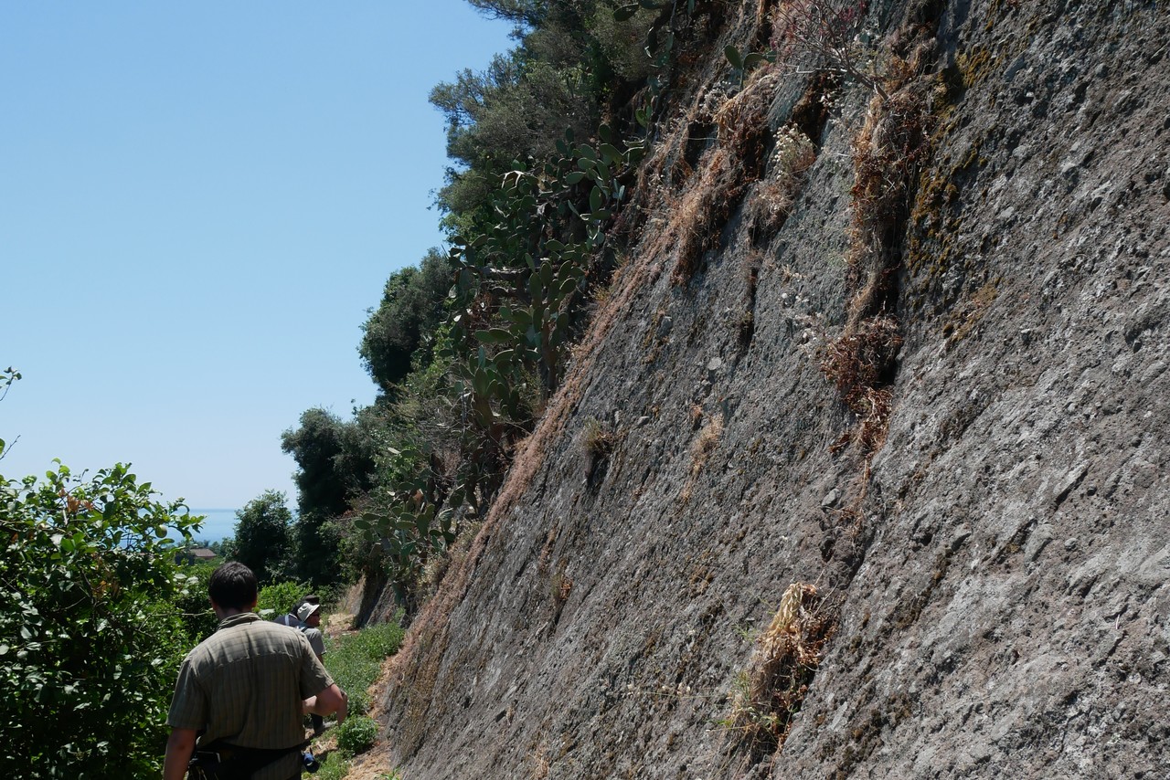 The S. Tecla Fault covers a large area with a scarp height that reaches 190 m a.s.l. It extends for 5 km and reaches 2.5 km offshore. The master fault offsets a 200-0 kyr volcanic sequence, from the bottom to the top. The historical seismicity is characterised by eight events from 1865 until 2005, with magnitude ranging between 3.4 and 4.7. Very important evidence for recent rapid vertical deformation at the base of the fault scarp has been found - a nude surface exposed, for a length of 20 m and with a 0.25 m height of rapid vertical deformation, where oblique slickensides are visible with pitches ranging between 30° and 50°, that indicate a right-lateral component of slip. Through a technique called lichenometry, scientists were able to calculate, through the size of the lichens, a relative time difference between the fresh slickenside and the older part of the scarp. Thanks to a nearby abandoned house they were able to associate this relative time difference with absolute time. Through these measurements they've found that the fresh slickenside can be associated with the earthquake of the 3rd August 1973 (3.8 M).