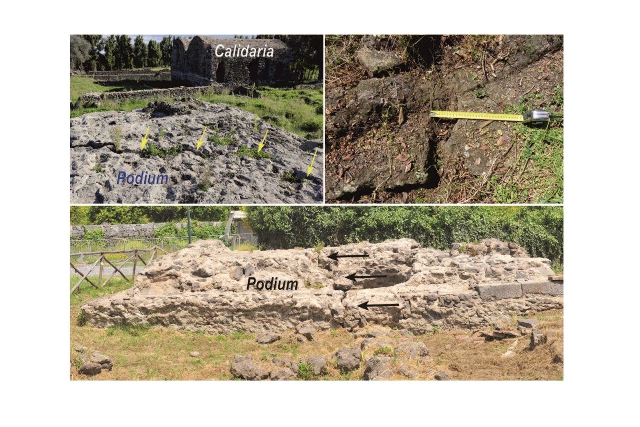 In the archaeological site of Santa Venera al Pozzo, near Acireale, we can see an excellent case of coseismics damages: the roman podium is faulted and nearby this damages there are a sulphur waters spring with roman baths. This mean that the seismic in this area is still active and that deep faults connects idrothermal systems with the surface.