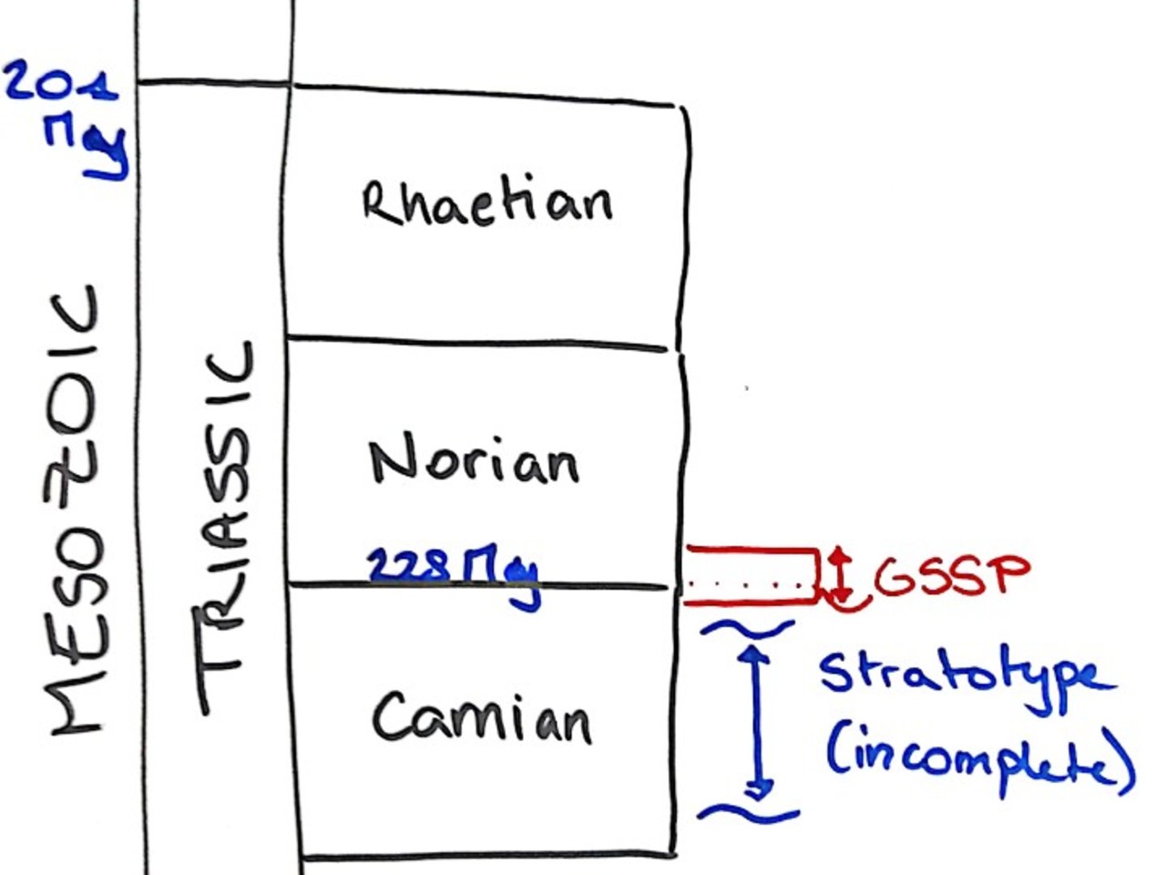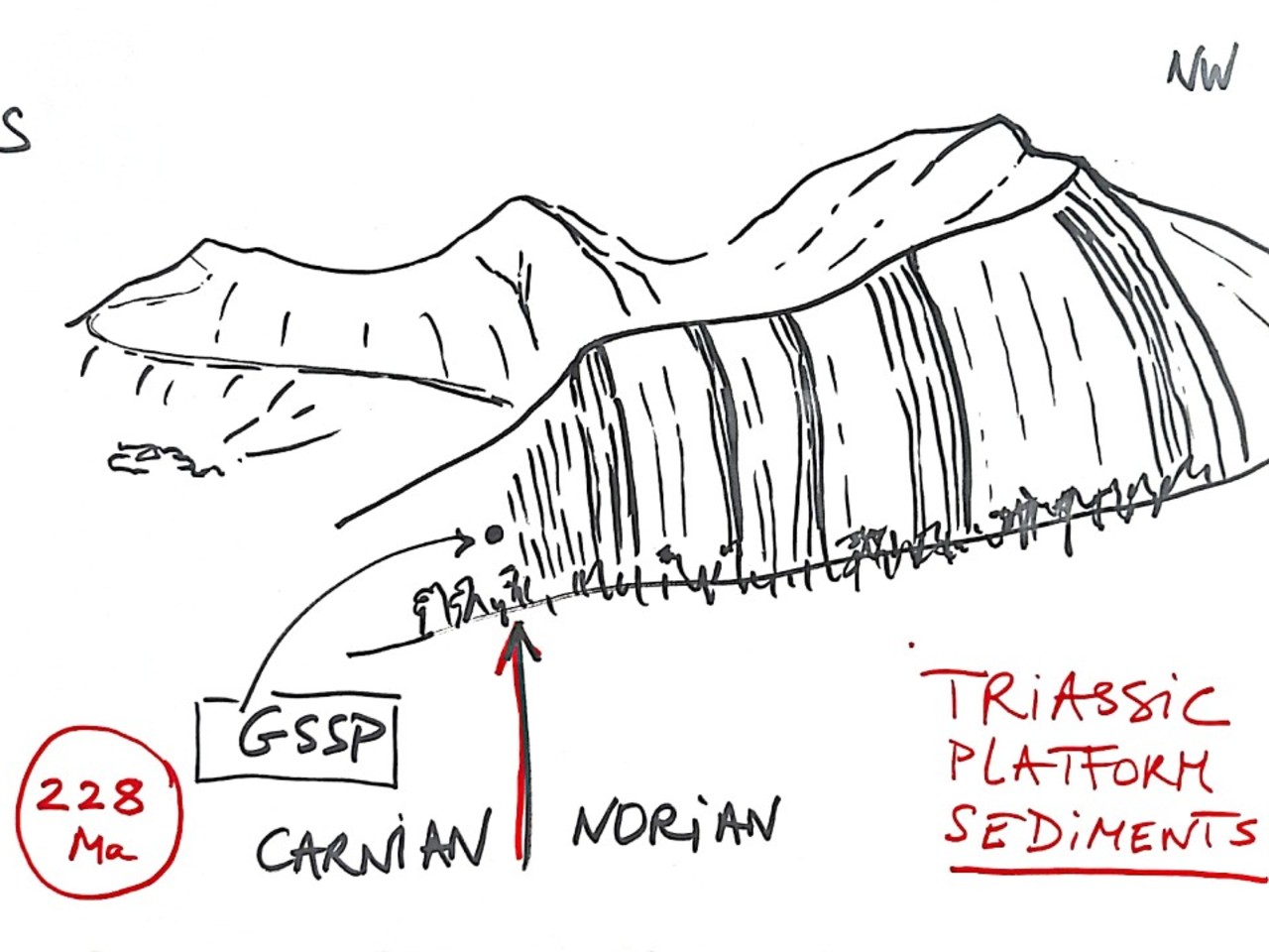 What is a GSSP? For a long time, stratigraphers used stage stratotypes to define stages, but there are really few localities where a stage is complete. In the late 70s they decided to define the boundaries between stages as GSSPs, short for Global Stratotype Section and Points. It’s a way more restricted interval of time, defined with as many criterias as possible, chemo/magneto/bio-stratigraphy etc. At Pizzo Mondello, the main criteria is the first occurence of Halobia austriaca, a 3 to 5 cm wide species of bivalve.