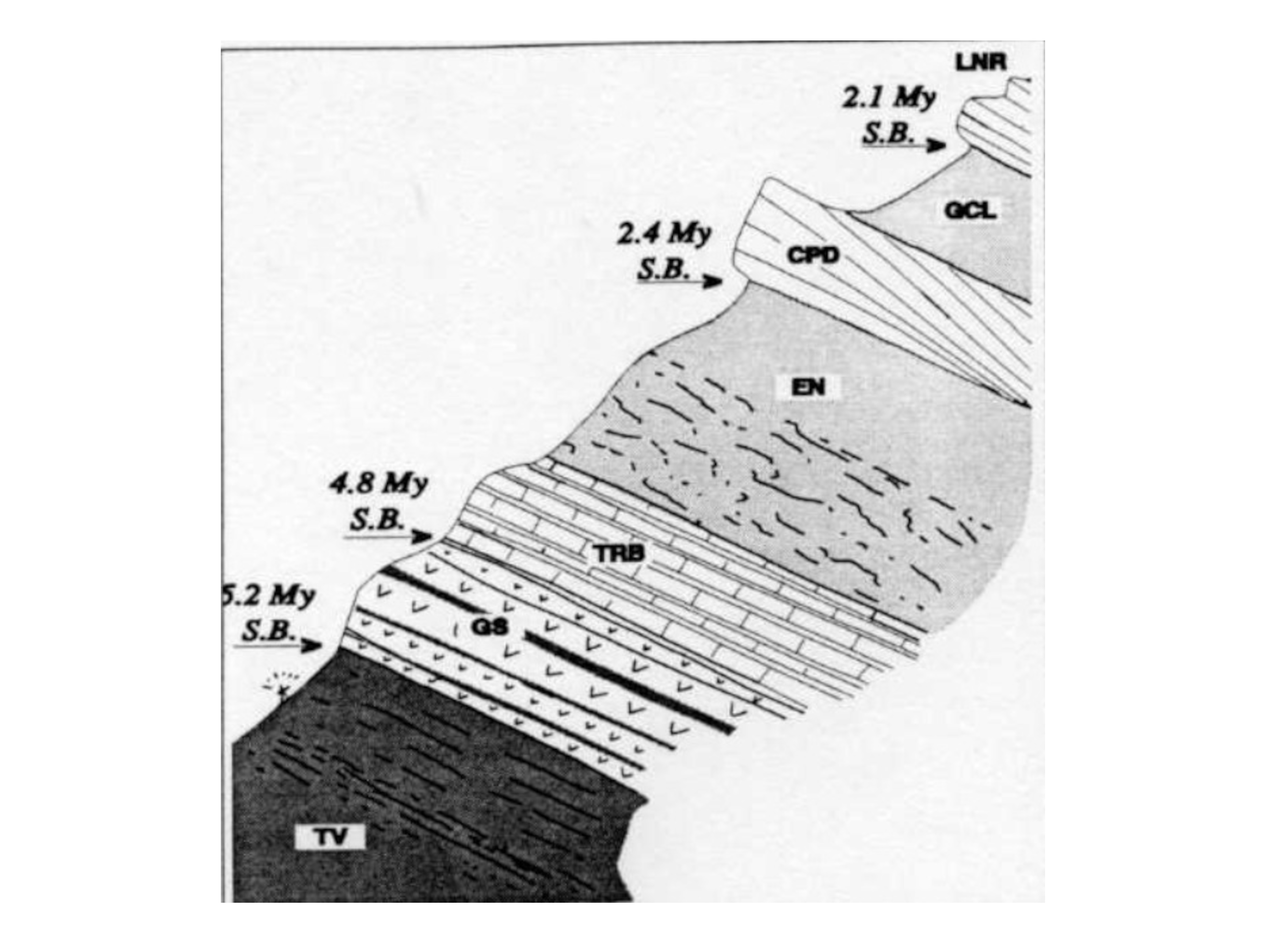 When thinking about the Mediterranean Sea in the Miocene the first thing that comes to mind is the Messinian Salinity Crysis (MSC) and to find the best expressions of this event in Sicily we would need to search in either the central or southern portion of the island. In particular the Caltanissetta basin in central Sicily has arguably the best exposed sedimentary record for the events that occurred in the Miocene, before, during and after the MSC. TV - Sandstones and mudstones, Terravecchia formation, late Tortonian; GS - Evaporites and Marls, Gessoso Solfifera formation, Messinian; TRB - pelagic marly limestones, Trubi fm., early Pliocene; EN - basinal slope claystones and siltstones, Enna fm., middle Pliocene; CPD - silty mudstones, sandstones and beach biocalcarenites, Capodarso fm., middle Pliocene; GCL - sandy and silty mudstones, Geracello fm., middle Pliocene; LNR - calcarenites and siltstones, Lànnari fm., middle-late Pliocene; S.B. - Sequence boundaries physically expressed by abrupt facies changes or erosional truncations due to the downward shift of the costal onlap
