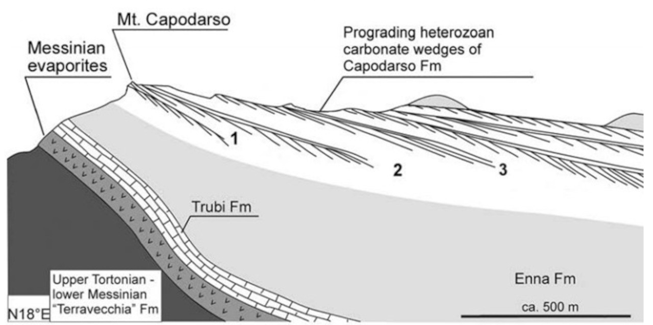 Mount Capodarso is among the best outcrops in the basin for our theme of interest. It’s located between the municipal border of Caltanissetta and Enna and is enlisted in the Rocca di Cerere Geopark. The site displays a continuous stratigraphic section covering from the Tortonian all the way to middle Pleistocene with the following lithostratigraphic sequence (Tortorici, 2014). Terravecchia Formation (Lower Tortonian-Lower Messinian), Marls and silty claystone with interlayered lenses of quartz arenitc or conglomeratic/breccia of Numidian Flysch. Interesting to note the badlands geomorphology. Thickness from 300 to 400m (Schmidt Di Friedberg, 1962) Tripoli (Lower Messinian), diatomite alternated with bituminous marls in which Teleost fish fossils were found like Bregmaceros sp., Myctophum sp., Syngnathus sp. This lithostratigraphic unit is characteristic for the anoxic environment indicative of a switch from normal marine sedimentation to evaporitic conditions. Usual thickness is lower than 30m (Del Frati, 2007) Cattolica Formation (Lower Messinian) belonging to Gessoso Solfifera Group (Roveri & Manzi, 2007). Is divided in four members but only two of this are outcropping in our area of interest, the first being the Calcare di base made up of massive to laminated limestones occasionally containing lenses of Halite pseudomorphs and Gypsum and the second being the Selenitic Member made up of massive to thinly laminated Gypsum. (Del Frati, 2007) Trubi (Zanclean) alternation between calcareous marls and argillaceous marls, depending on the ratio of planktonic foraminifera to clay minerals, with decametric strata and abundant fractures. The analysis of foraminifera and nannofossils allows researcher to estimate the age and the pelagic nature of the depositional environment. (Del Frati, 2007) Enna Formation (Piacenzian) divided in two members, the basal Enna Marls and the apical Capodarso Calcarenite (Roda, 1968). The Enna marls is a 250m thick succession of marlstone and argillaceous marlstones with irregular fractures and weak stratification, rarely interrupted by arenaceous lenses. The arenaceous component gets more abundant upward until it makes up the Capodarso calcarenites. This last member is a 70m thick carbonatic cemented sandstone with clear clinostratification and crossed lamination. There are also fossiliferous levels containing bivalve fragments, rhodolite and echinoderms.