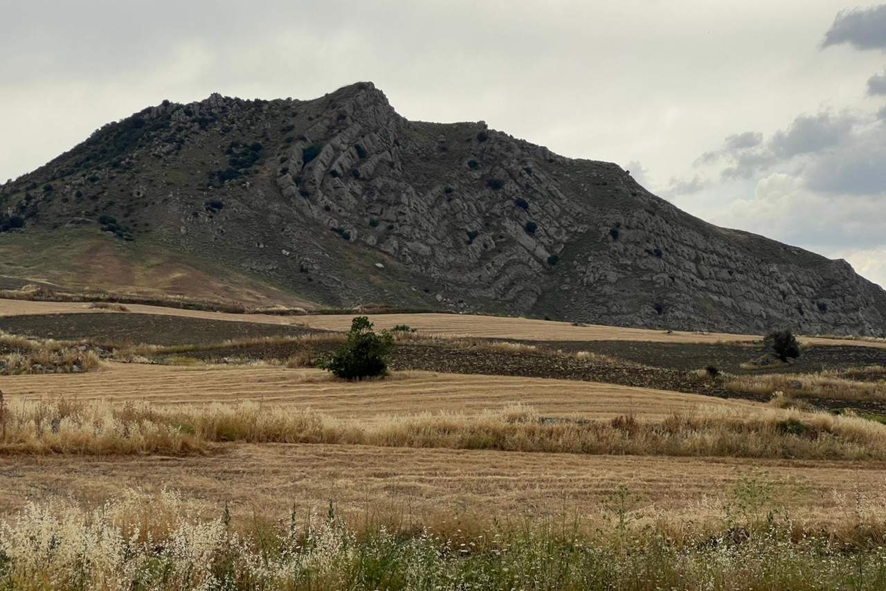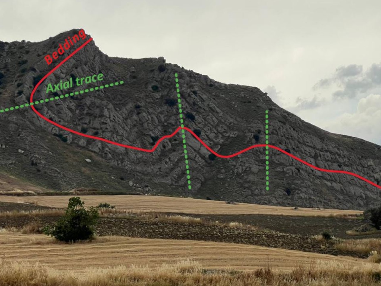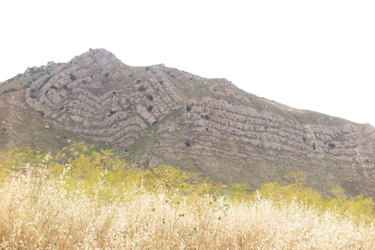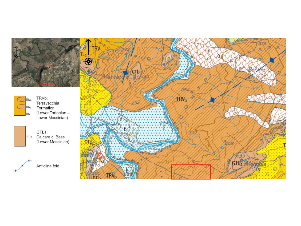 Monte Grande is a small mountain located in the middle of Sicily, in the southern part of Monti Erei area. It shows a tight, inclined and upright folding in well-bedded Calcare di Base and Terravecchia Formation. Calcare di Base is made by white and grey limestone with levels of grey mudstone. The Terravecchia Formation is composed of marls and silty claystone with interlayered lenses of quartz or conglomerate/breccia of Numidian Flysch. Both units are part of neogenic marine deposits. Monte Grande is part of a huge fold system that runs NE-SW in the middle of Sicily and in the outcrop it’s easy to see the folded bedding and the axial traces.